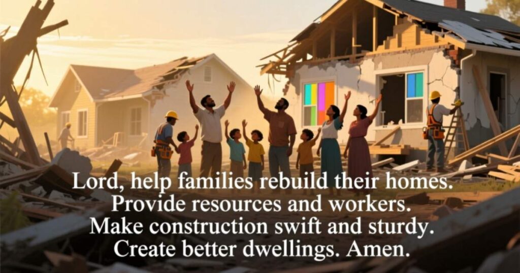 Watching your home destroyed breaks something deep inside. Rebuilding seems overwhelming and impossible. This prayer invites God into the reconstruction process completely. It asks for provision of materials, money, and skilled labor. Every rebuilt home represents hope restored. We pray that new structures stand stronger than before.