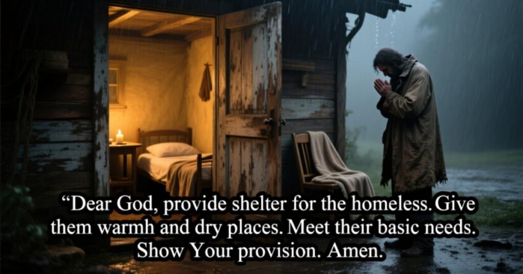 Losing your home creates immediate crisis and vulnerability. Families huddle together with nowhere to go. This prayer asks God to provide safe refuge for the displaced. It reminds us that basic needs matter deeply to our Creator. Shelter represents security, dignity, and hope. We pray for quick provision of these essential comforts.